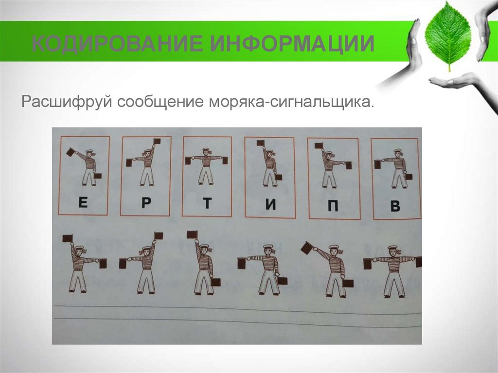 КОДИРОВАНИЕ ИНФОРМАЦИИРасшифруй сообщение моряка-сигнальщика.