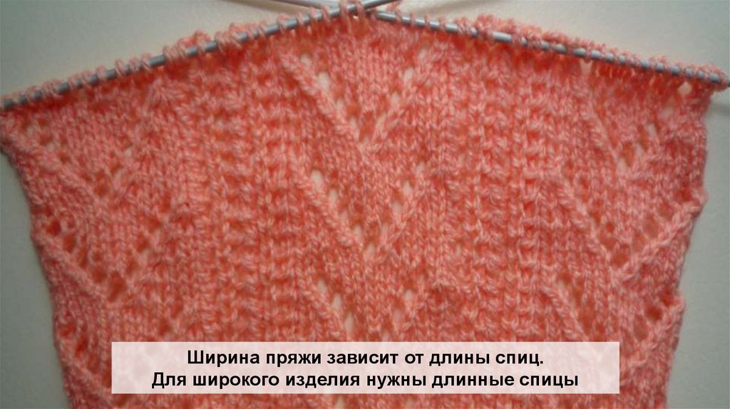 Ширина пряжи зависит от длины спиц.Для широкого изделия нужны длинные спицы