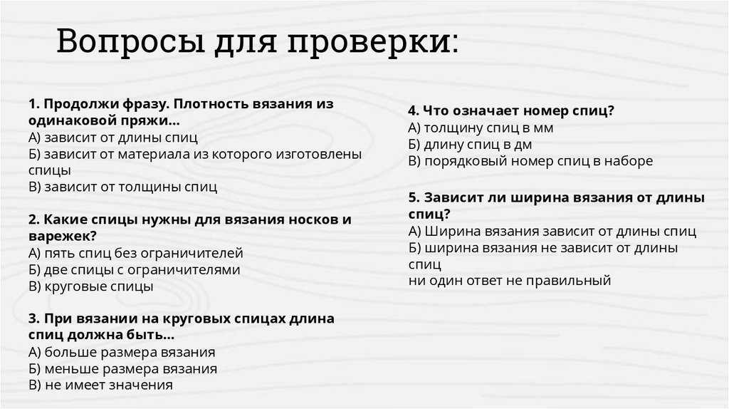 Вопросы для проверки:1. Продолжи фразу. Плотность вязания из