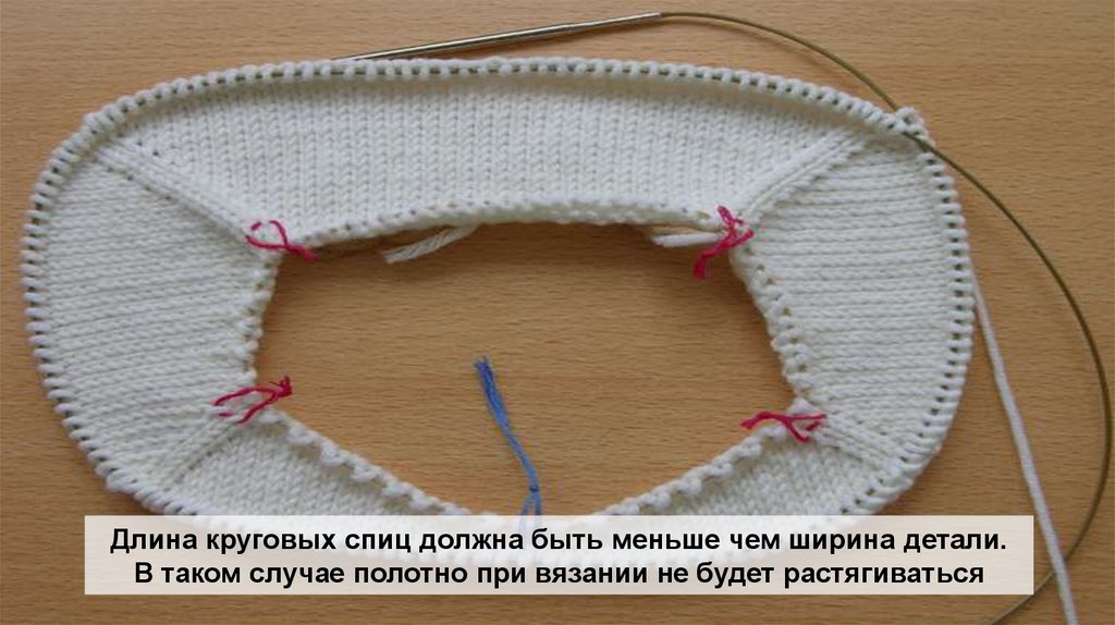 Длина круговых спиц должна быть меньше чем ширина детали.В таком случае полотно при вязании не будет растягиваться