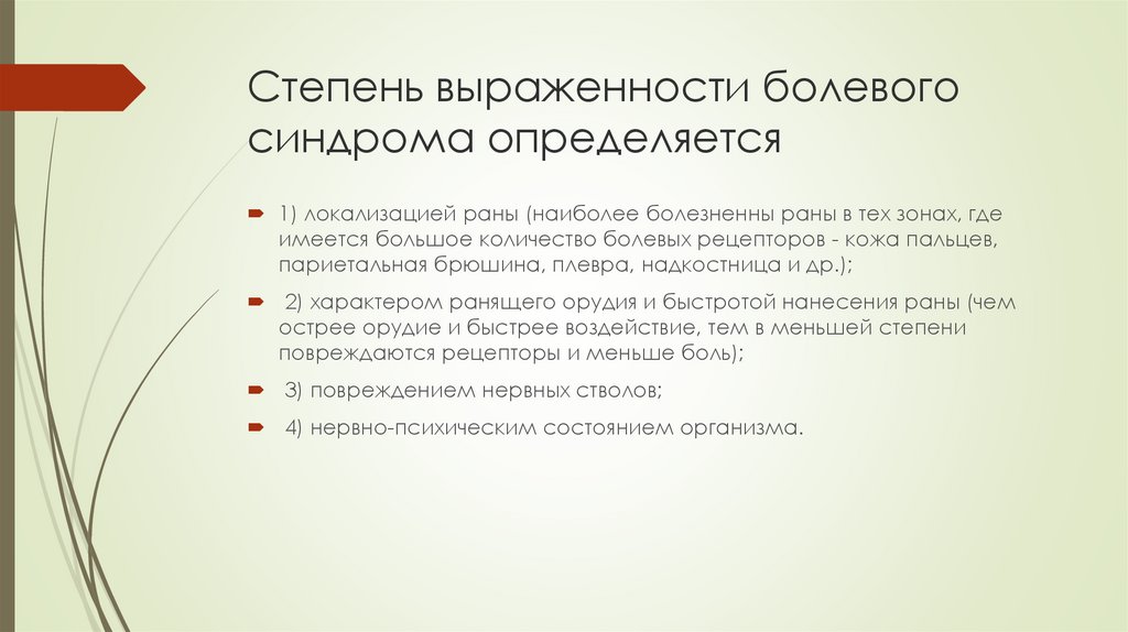 1) локализацией раны (наиболее болезненны раны в тех зонах, где