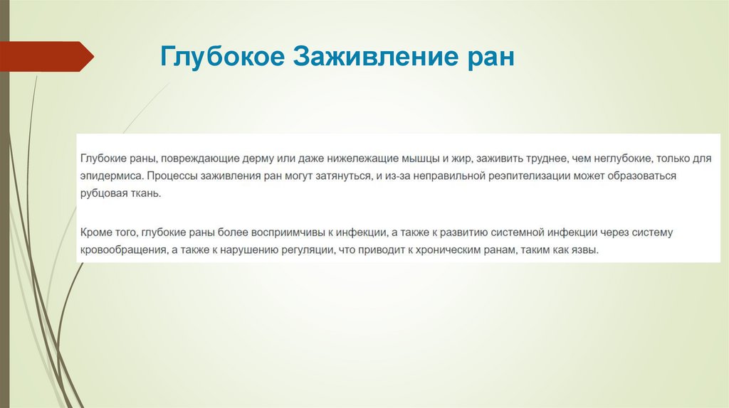 Процесс заживления глубоких ран аналогичен процессу заживлениянеглубоких. Однако при удалении дермы и связанных с ней придатков кожи