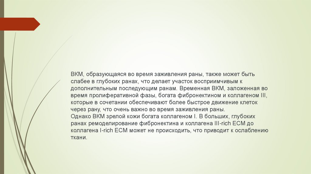 ВКМ, образующаяся во время заживления раны, также может бытьслабее в глубоких ранах, что делает участок восприимчивым к