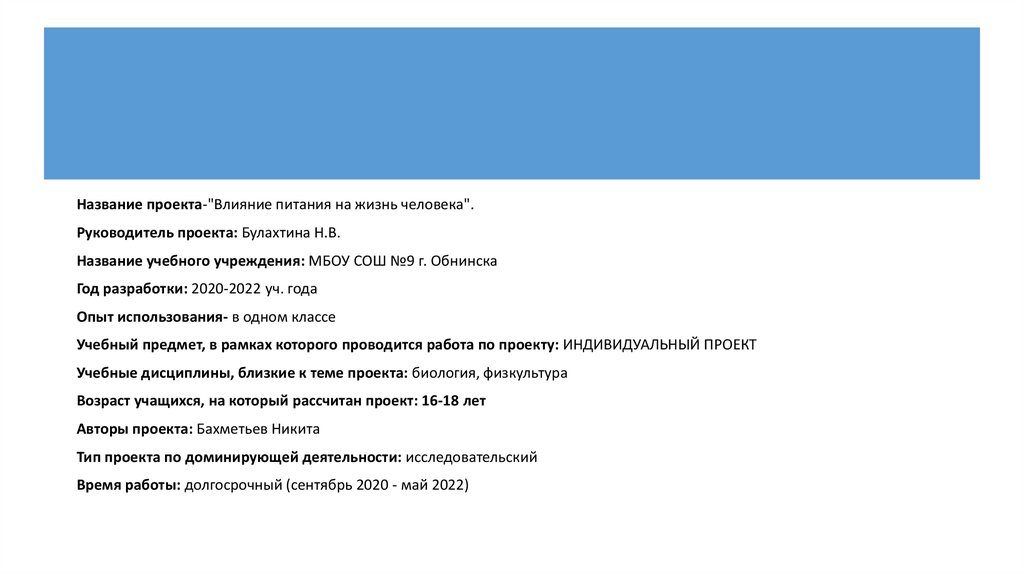 Название проекта-"Влияние питания на жизнь человека".Руководитель проекта: Булахтина Н.В.