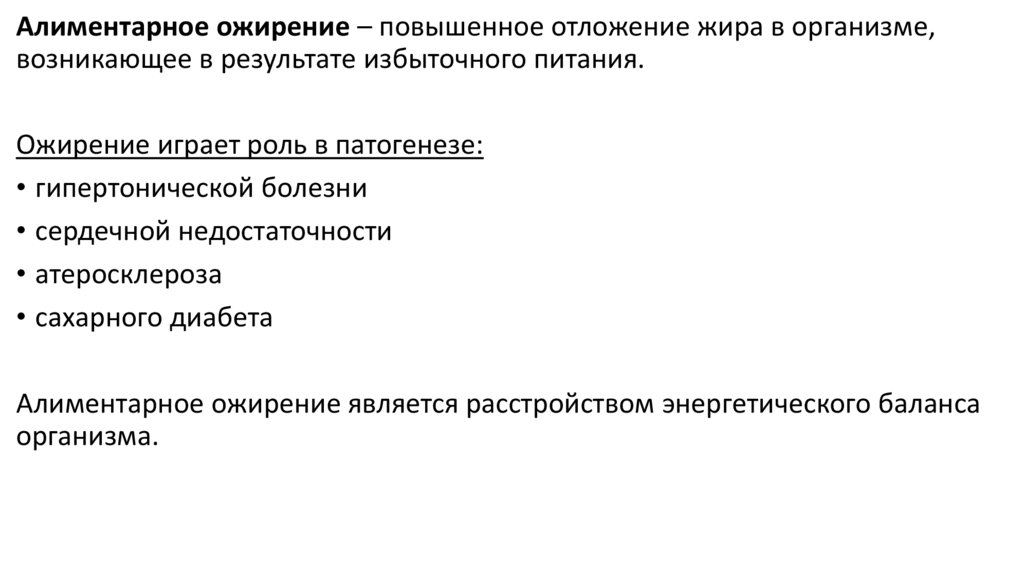 Алиментарное ожирение – повышенное отложение жира в организме,возникающее в результате избыточного питания.
