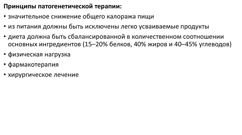 Принципы патогенетической терапии:• значительное снижение общего калоража пищи
