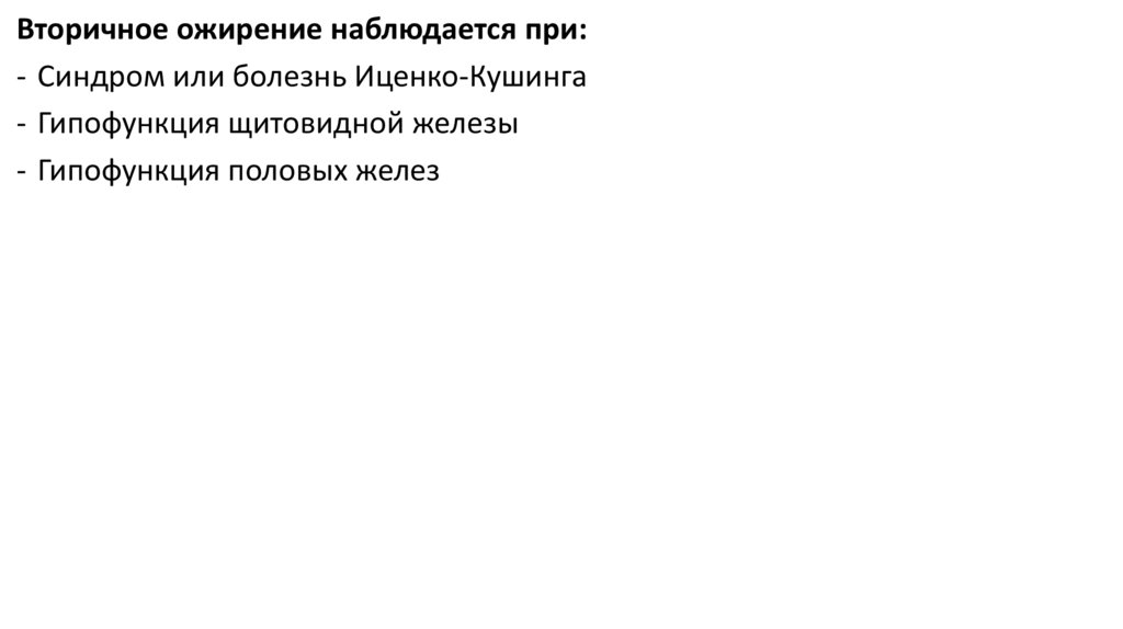 Вторичное ожирение наблюдается при:- Синдром или болезнь Иценко-Кушинга