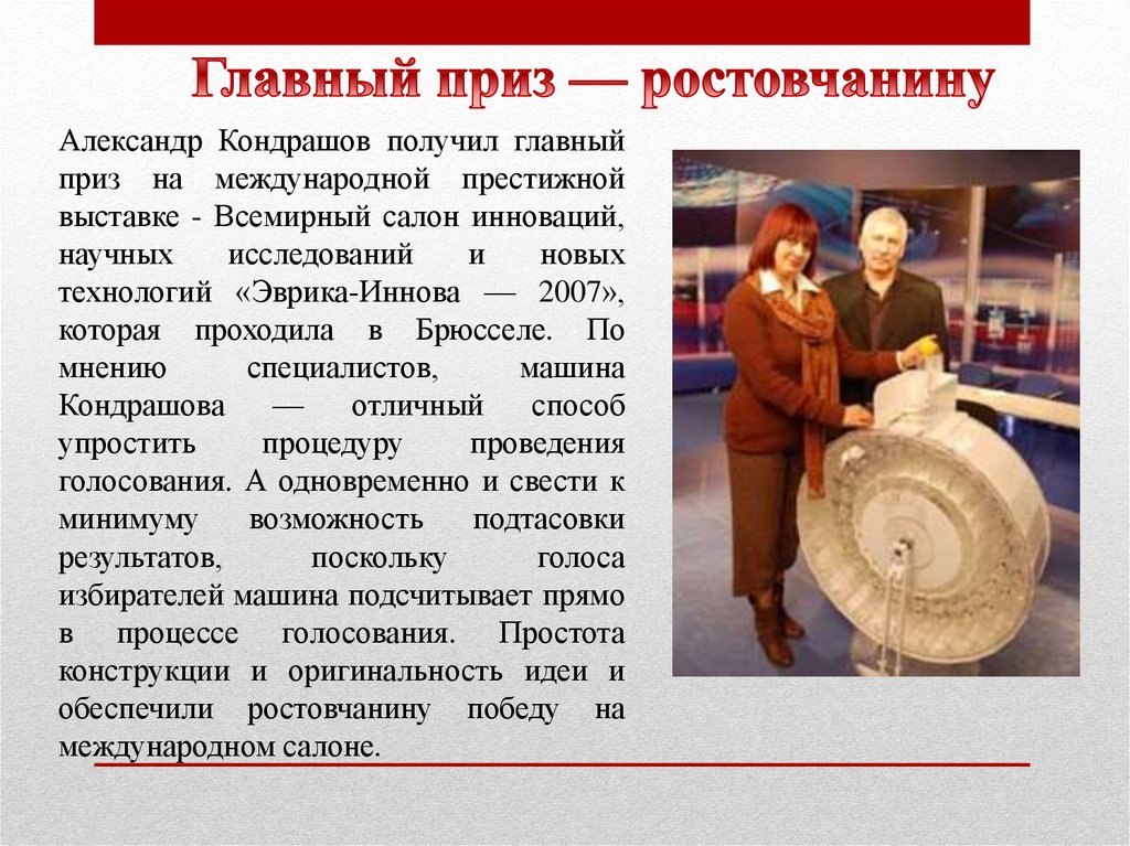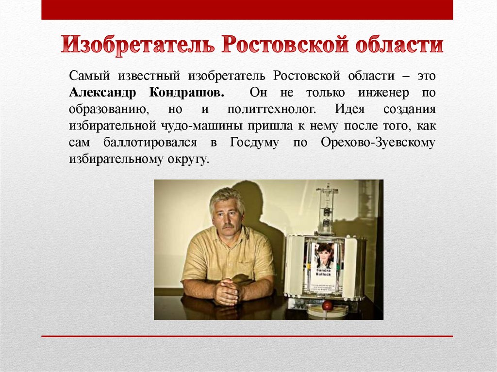 Самый известный изобретатель Ростовской области – этоАлександр Кондрашов.