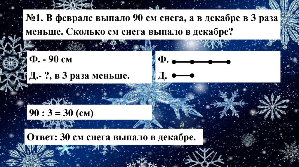 №1. В феврале выпало 90 см снега, а в декабре в 3 разаменьше. Сколько см снега выпало в декабре?