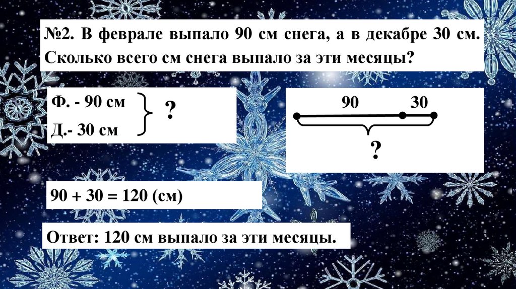 №2. В феврале выпало 90 см снега, а в декабре 30 см.Сколько всего см снега выпало за эти месяцы?