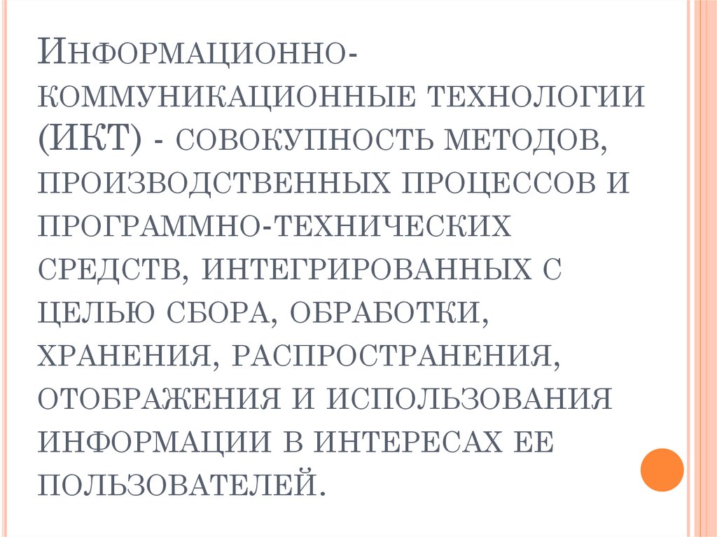 ИНФОРМАЦИОННОКОММУНИКАЦИОННЫЕ ТЕХНОЛОГИИ(ИКТ) - СОВОКУПНОСТЬ МЕТОДОВ,