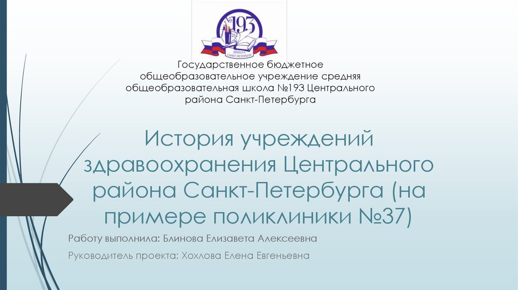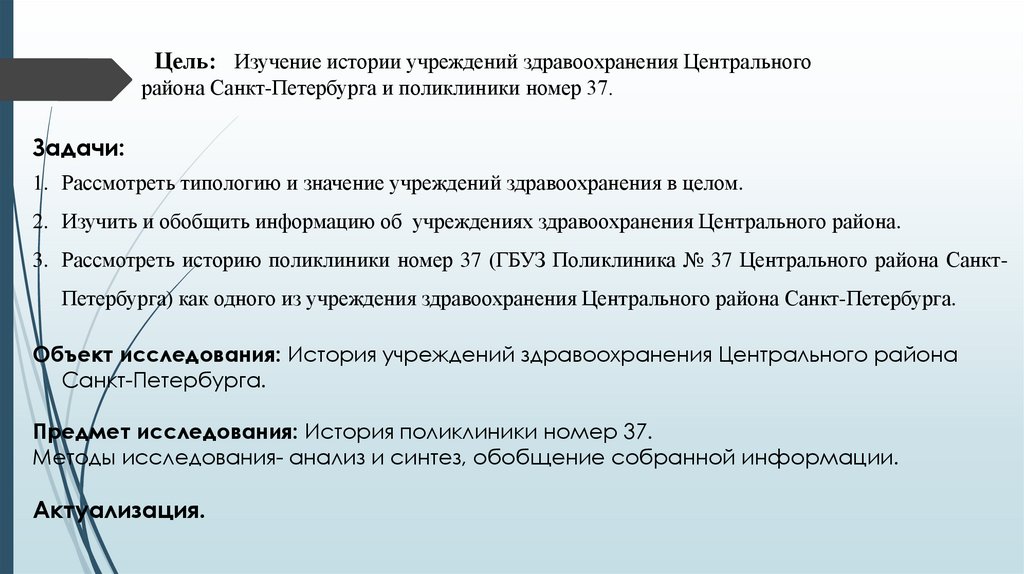 Цель: Изучение истории учреждений здравоохранения Центральногорайона Санкт-Петербурга и поликлиники номер 37.