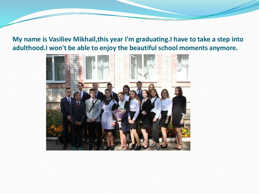 My name is Vasiliev Mikhail,this year I'm graduating.I have to take a step intoadulthood.I won't be able to enjoy the beautiful school moments anymore.