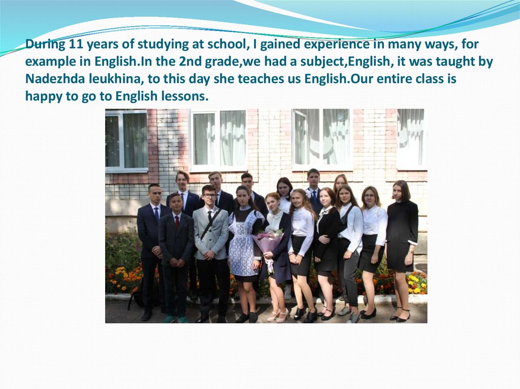 During 11 years of studying at school, I gained experience in many ways, forexample in English.In the 2nd grade,we had a subject,English, it was taught by