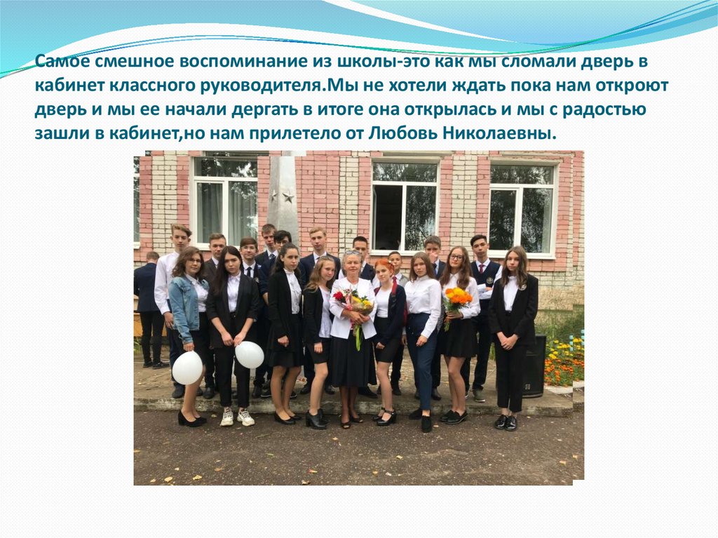 Самое смешное воспоминание из школы-это как мы сломали дверь вкабинет классного руководителя.Мы не хотели ждать пока нам откроют