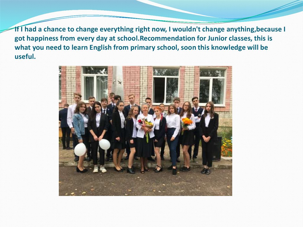 If I had a chance to change everything right now, I wouldn't change anything,because Igot happiness from every day at school.Recommendation for Junior classes, this is