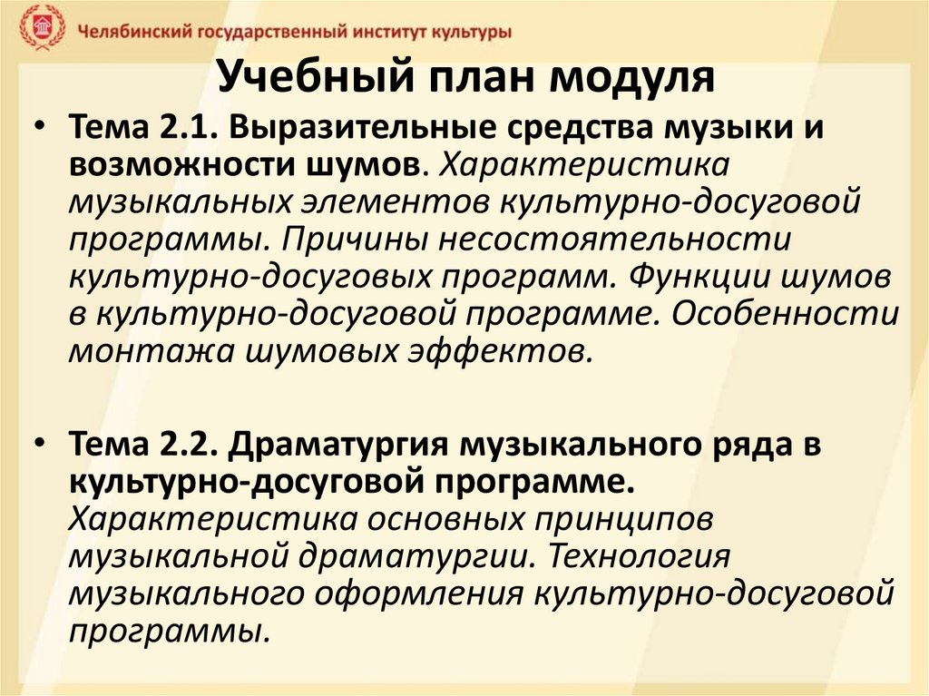 Учебный план модуля• Тема 2.1. Выразительные средства музыки и