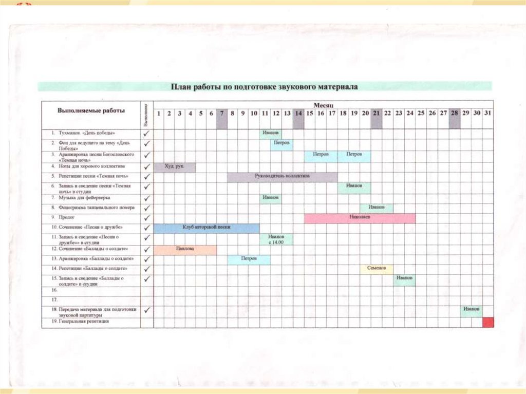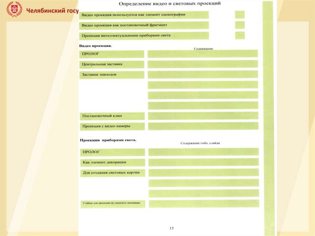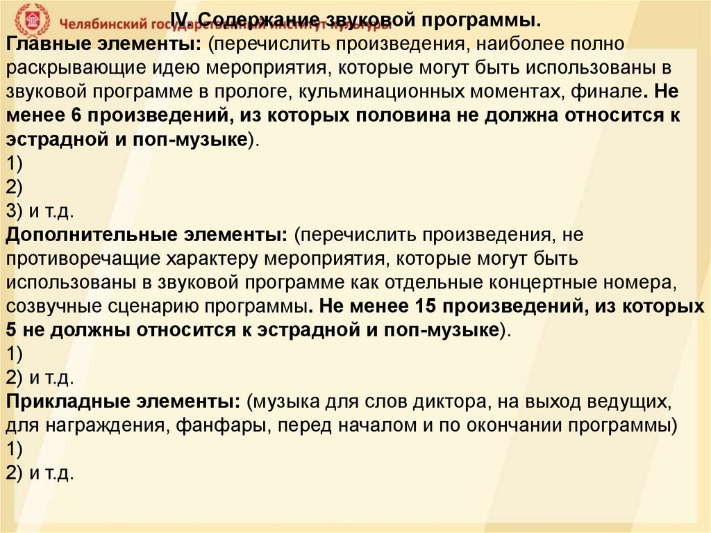 IV. Cодержание звуковой программы.Главные элементы: (перечислить произведения, наиболее полно