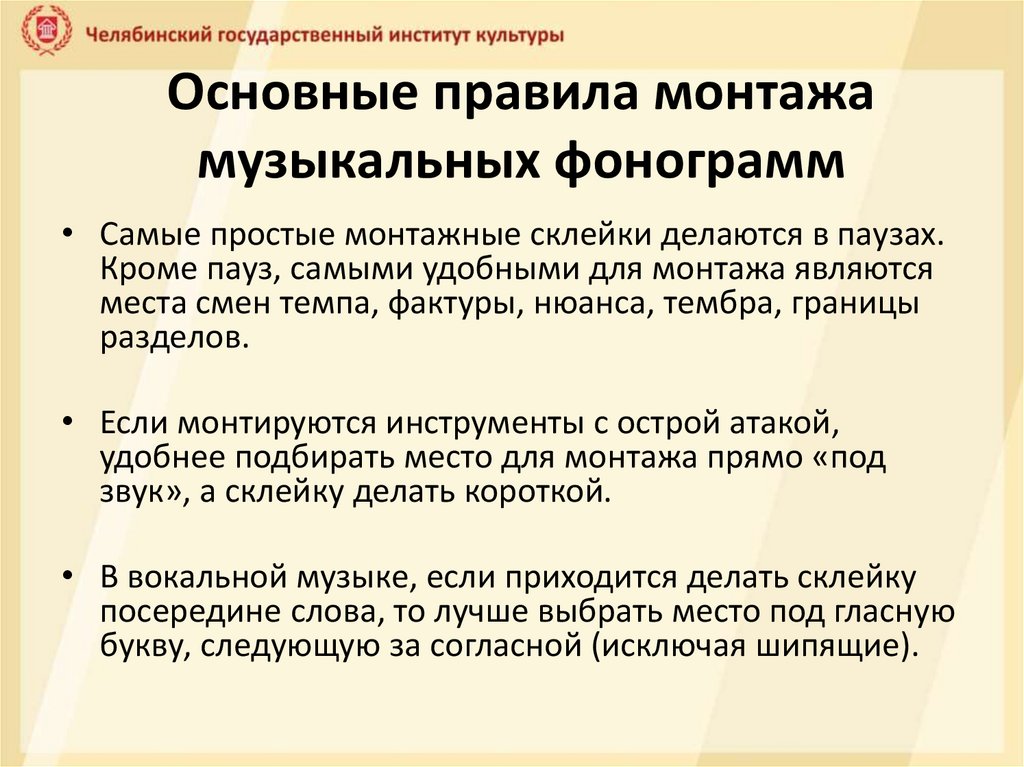 Основные правила монтажамузыкальных фонограмм