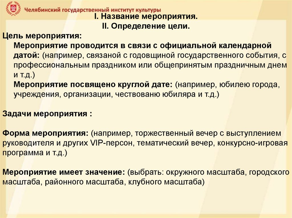I. Название мероприятия.II. Определение цели.