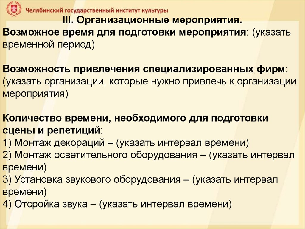 III. Организационные мероприятия.Возможное время для подготовки мероприятия: (указать