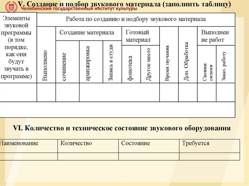 V. Создание и подбор звукового материала (заполнить таблицу)Заказ. работу