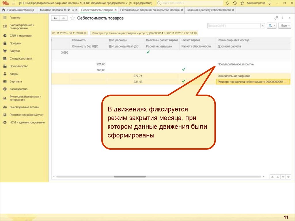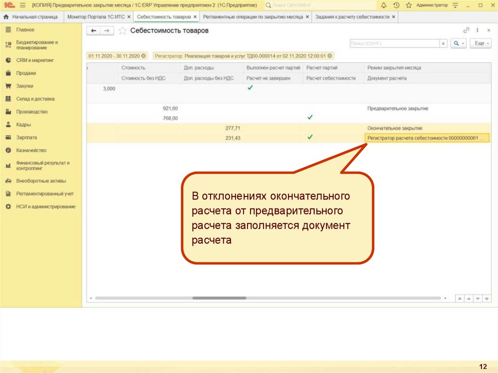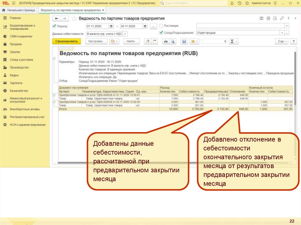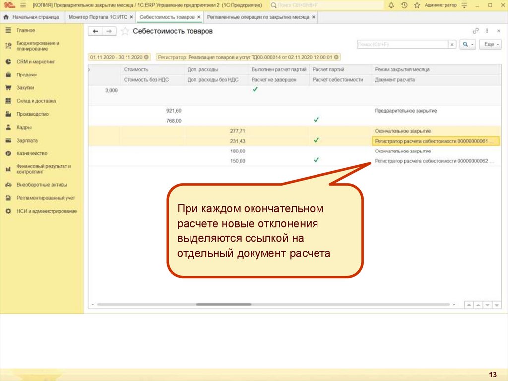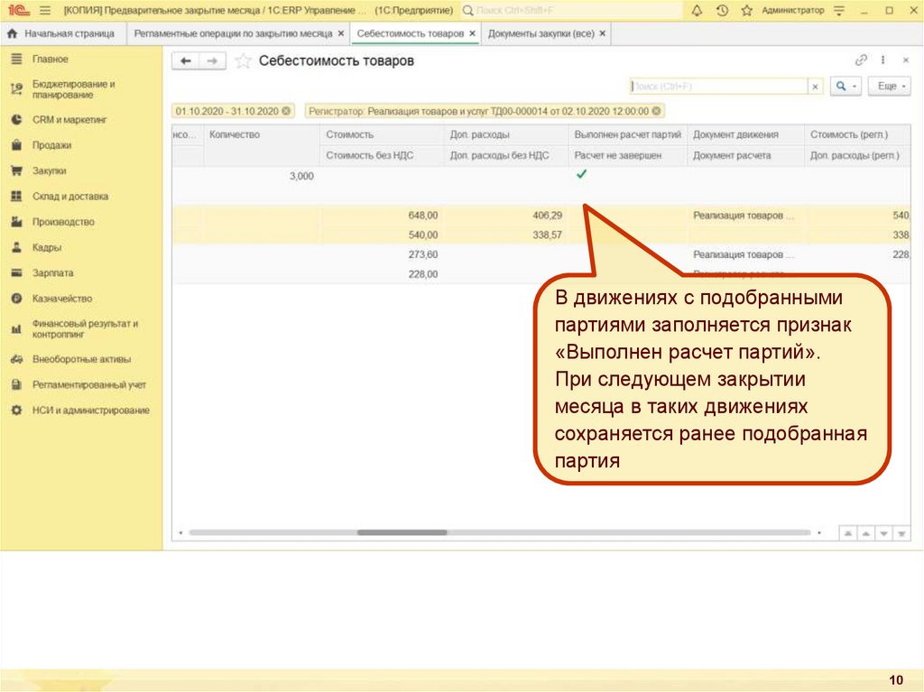 Предварительное закрытие месяца и выделение отклонений поддерживание только прииспользовании партионного учета версии 2.2