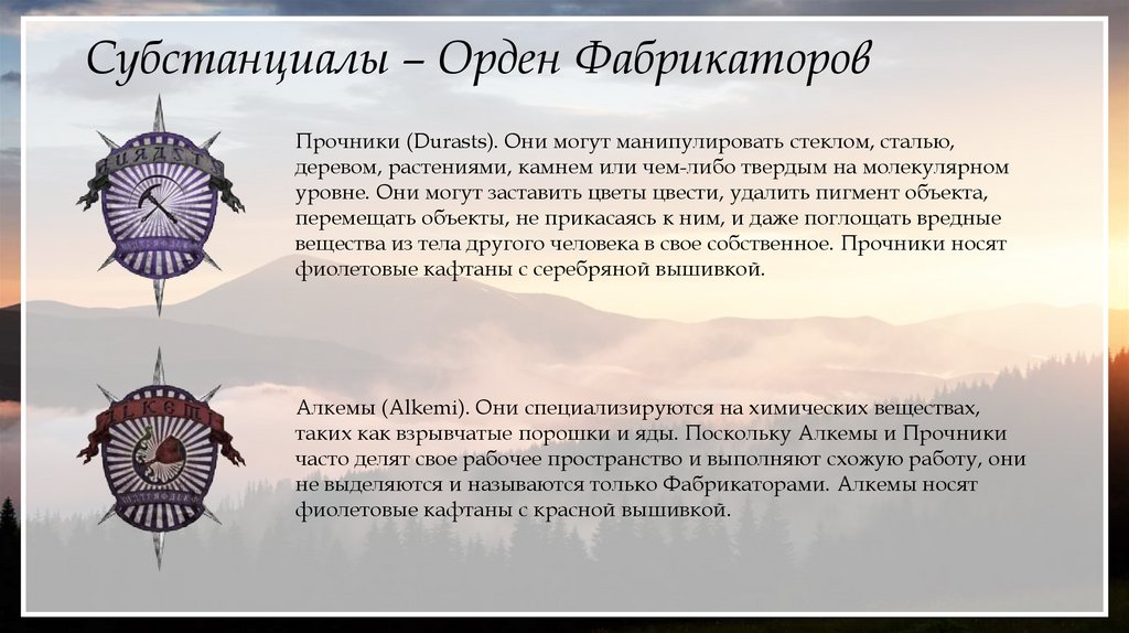 Субстанциалы – Орден ФабрикаторовПрочники (Durasts). Они могут манипулировать стеклом, сталью,