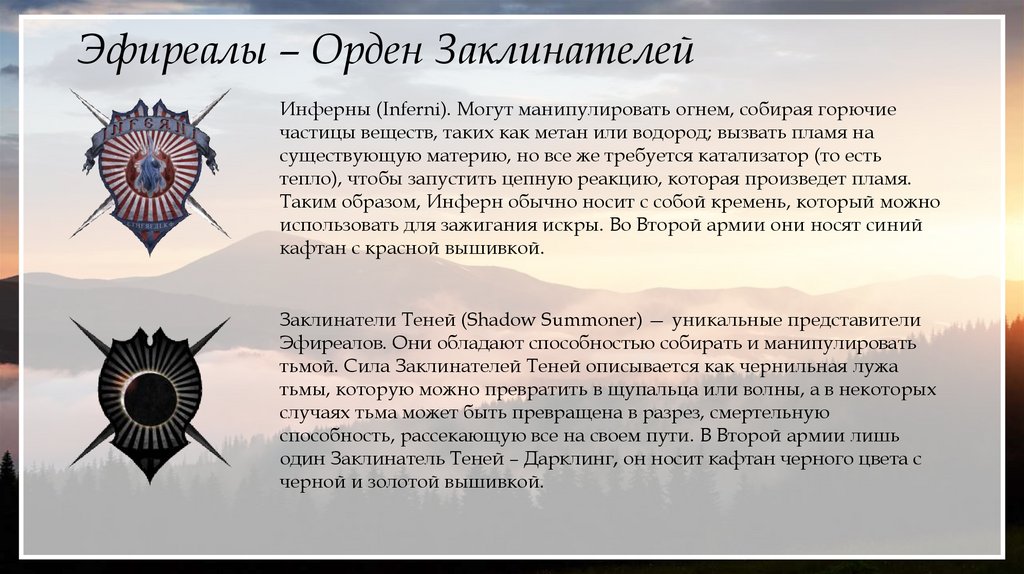 Эфиреалы – Орден ЗаклинателейИнферны (Inferni). Могут манипулировать огнем, собирая горючие