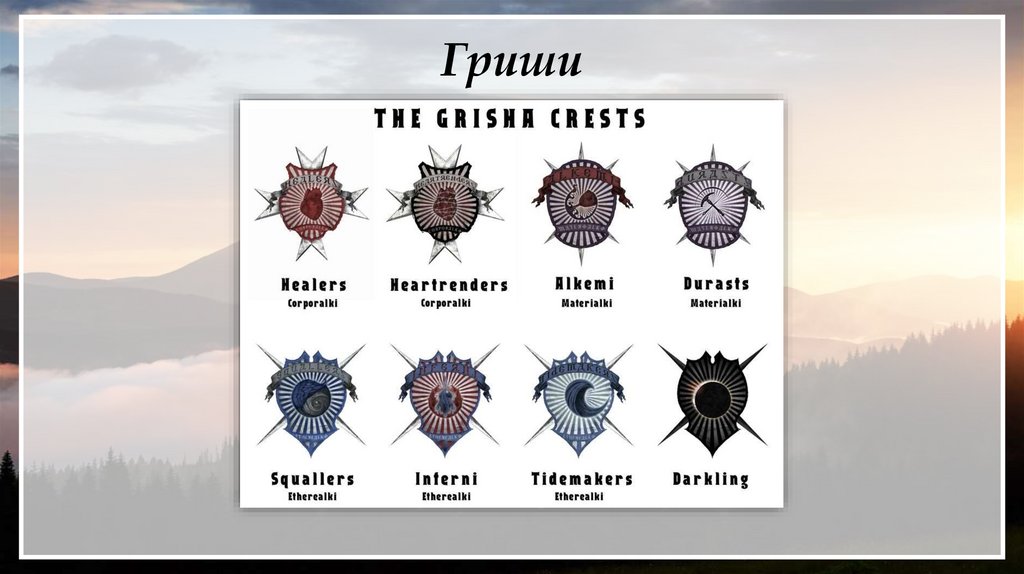 Гриши делятся на три ордена: Корпориалы, Эфириалы и