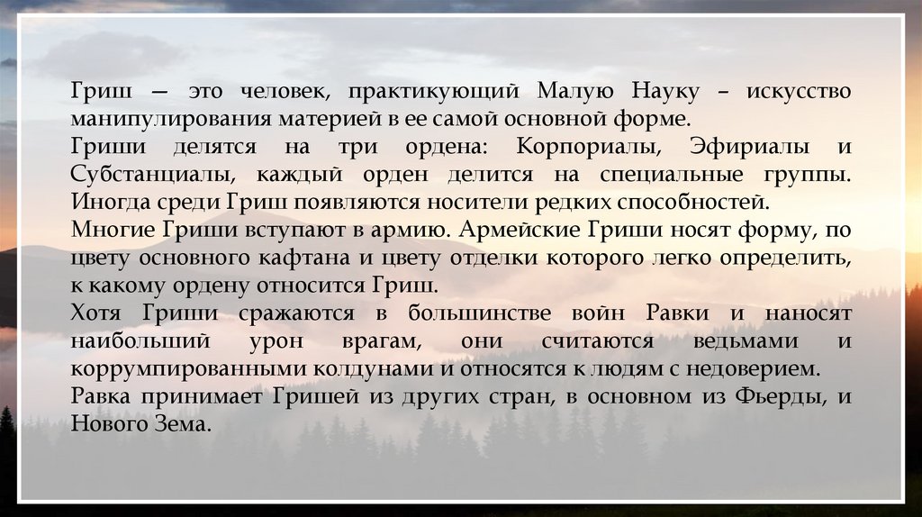 Гриш — это человек, практикующий Малую Науку – искусствоманипулирования материей в ее самой основной форме.