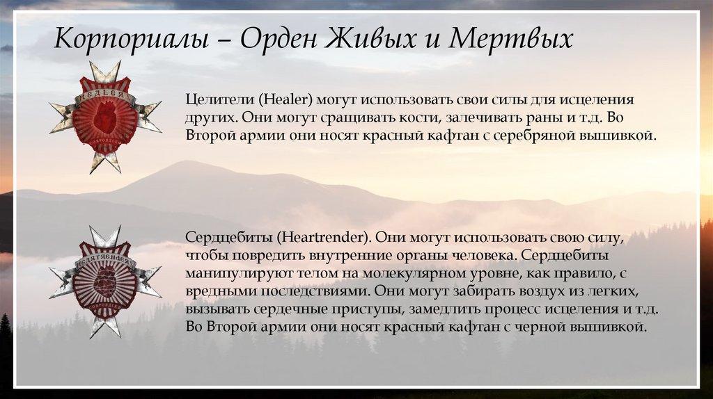 Корпориалы – Орден Живых и МертвыхЦелители (Healer) могут использовать свои силы для исцеления
