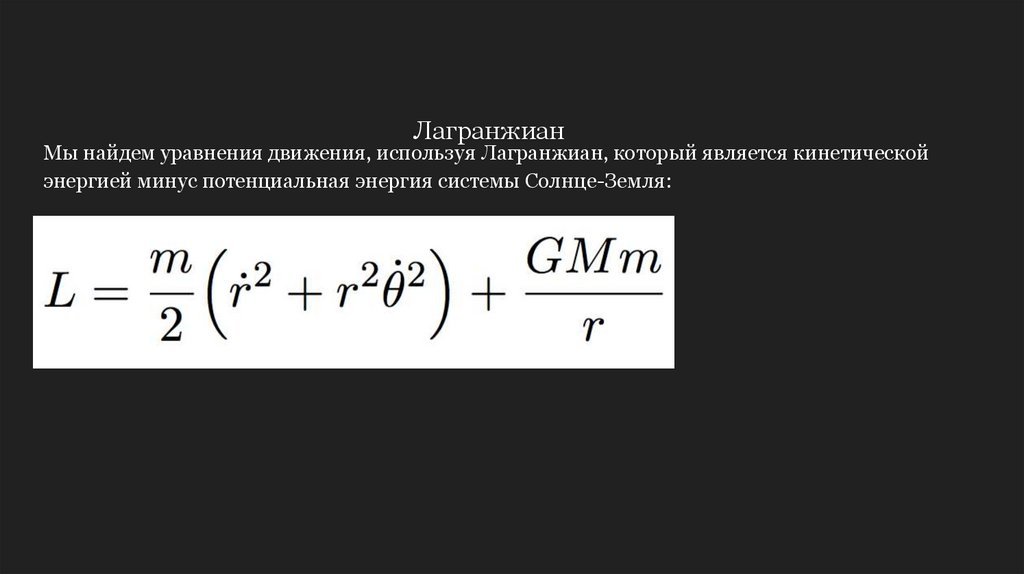 ЛагранжианМы найдем уравнения движения, используя Лагранжиан, который является кинетической