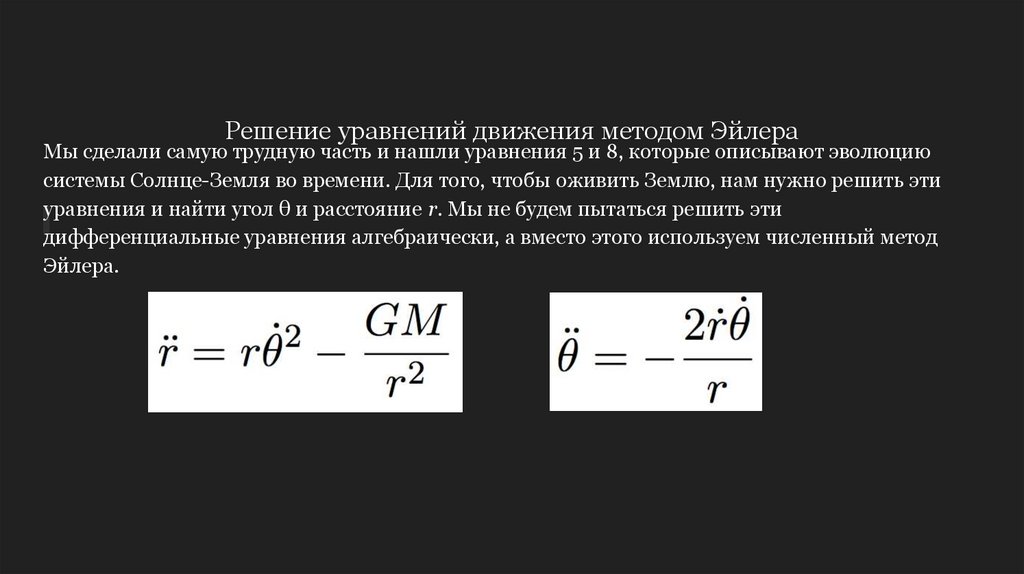 Решение уравнений движения методом ЭйлераМы сделали самую трудную часть и нашли уравнения 5 и 8, которые описывают эволюцию