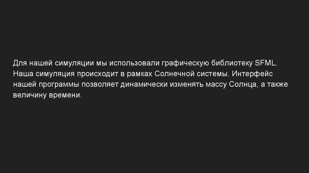 Для нашей симуляции мы использовали графическую библиотеку SFML.Наша симуляция происходит в рамках Солнечной системы. Интерфейс