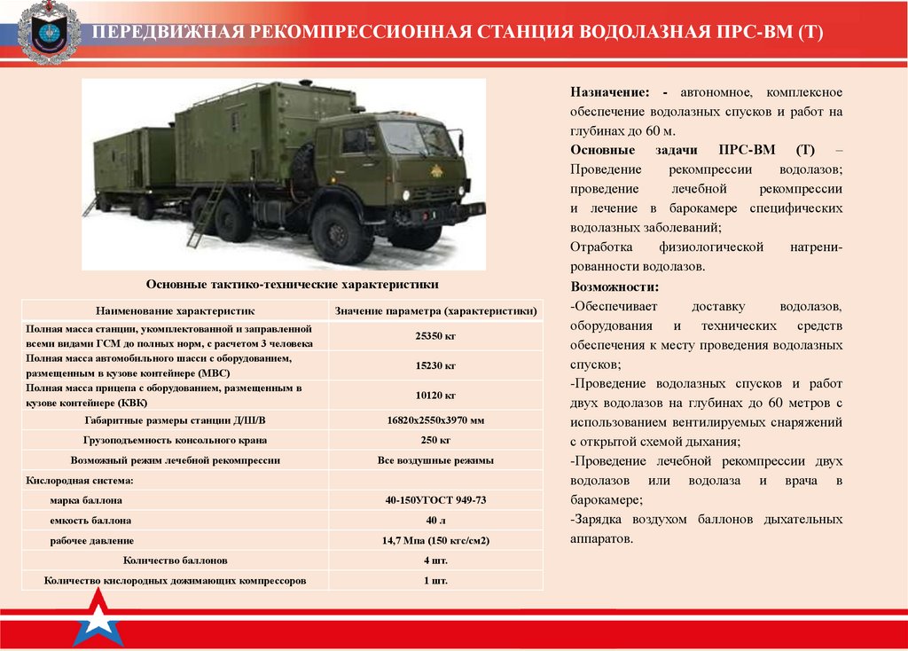ПЕРЕДВИЖНАЯ РЕКОМПРЕССИОННАЯ СТАНЦИЯ ВОДОЛАЗНАЯ ПРС-ВМ (Т)Основные тактико-технические характеристики