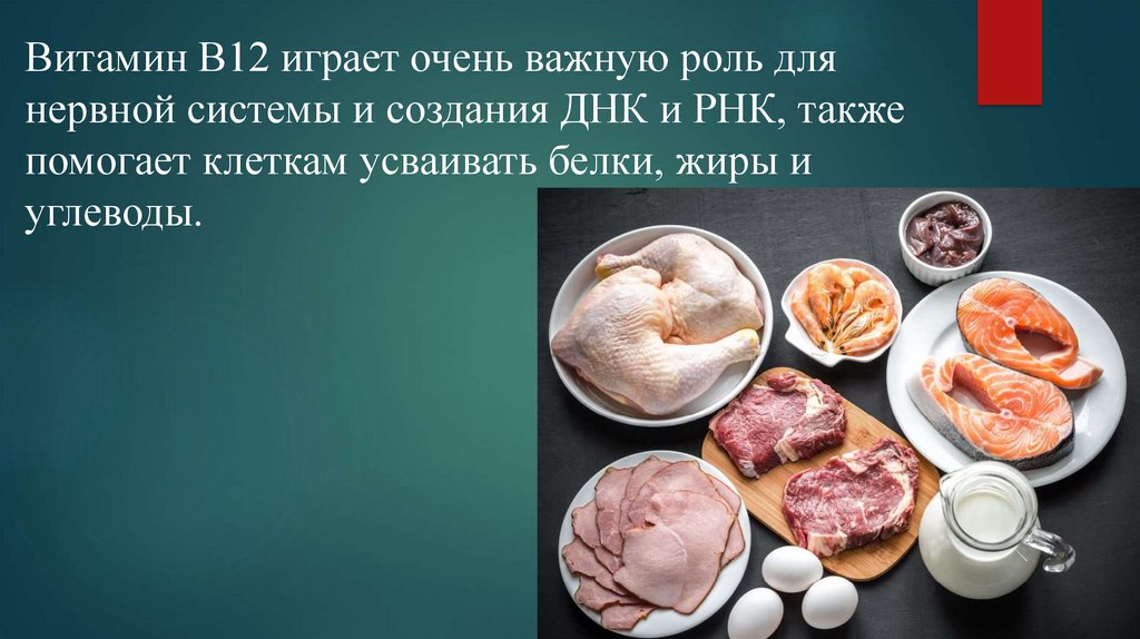 Витамин В12 играет очень важную роль длянервной системы и создания ДНК и РНК, также