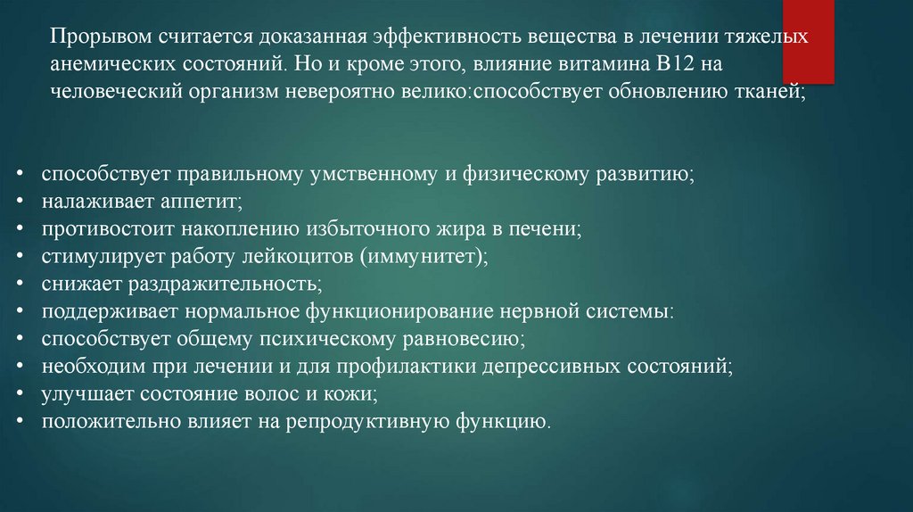 Прорывом считается доказанная эффективность вещества в лечении тяжелыханемических состояний. Но и кроме этого, влияние витамина B12 на