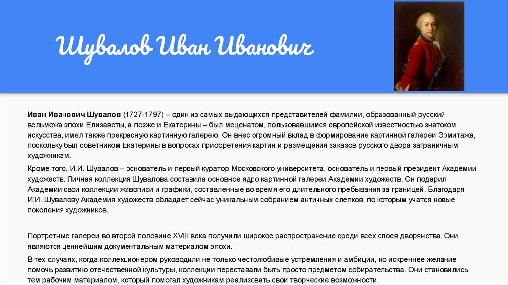 Шувалов Иван ИвановичИван Иванович Шувалов (1727-1797) – один из самых выдающихся представителей фамилии, образованный русский