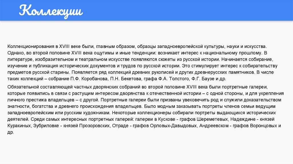 КоллекцииКоллекционирования в XVIII веке были, главным образом, образцы западноевропейской культуры, науки и искусства.