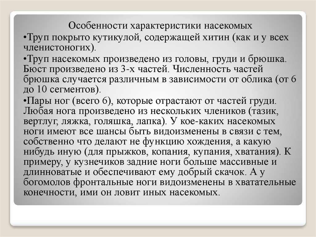 Особенности характеристики насекомых•Труп покрыто кутикулой, содержащей хитин (как и у всех