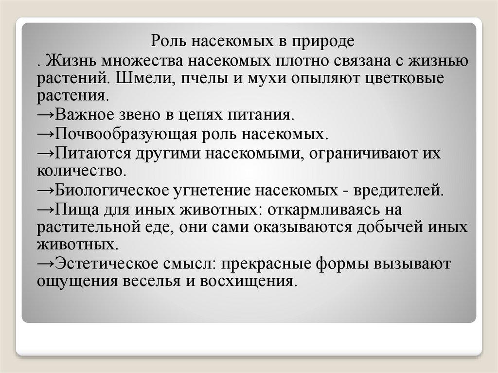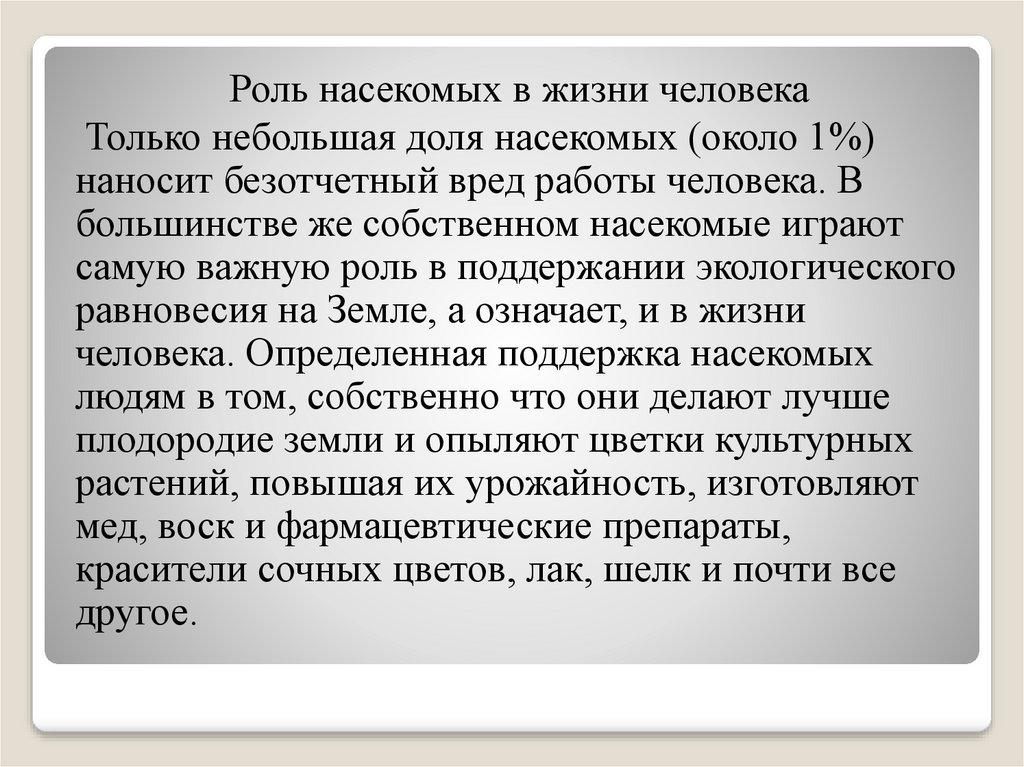 Роль насекомых в жизни человекаТолько небольшая доля насекомых (около 1%)