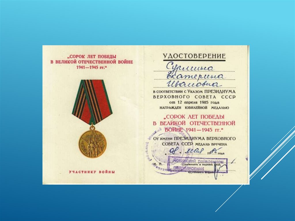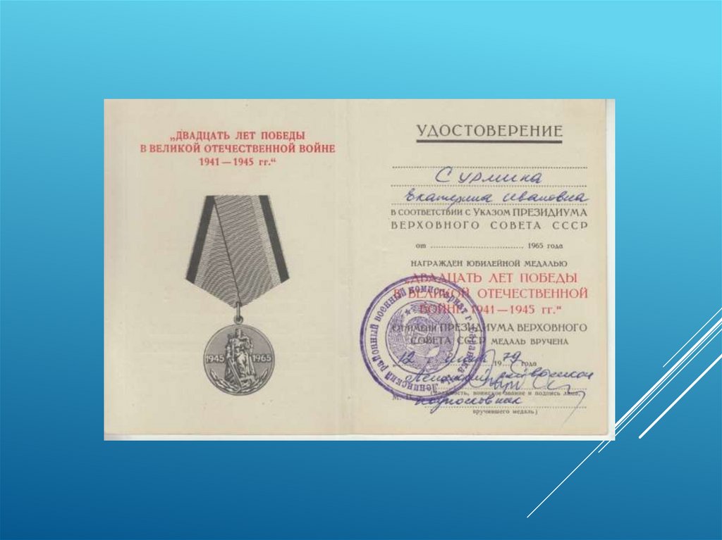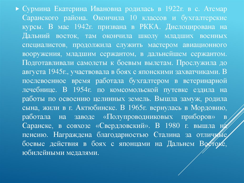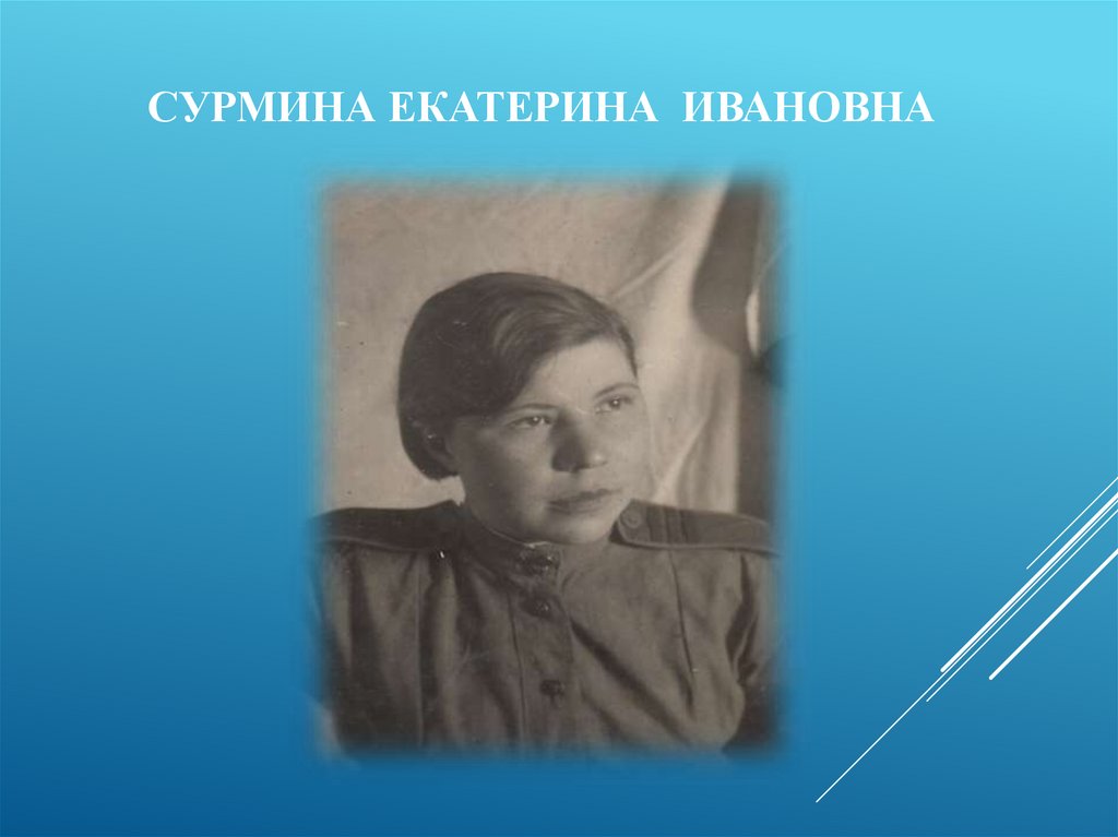 Сурмина Екатерина Ивановна родилась в 1922г. в с. АтемарСаранского района. Окончила 10 классов и бухгалтерские