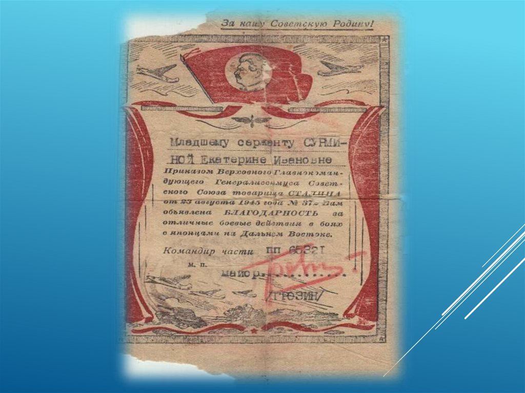августа 1945г., участвовала в боях с японскими захватчиками. В