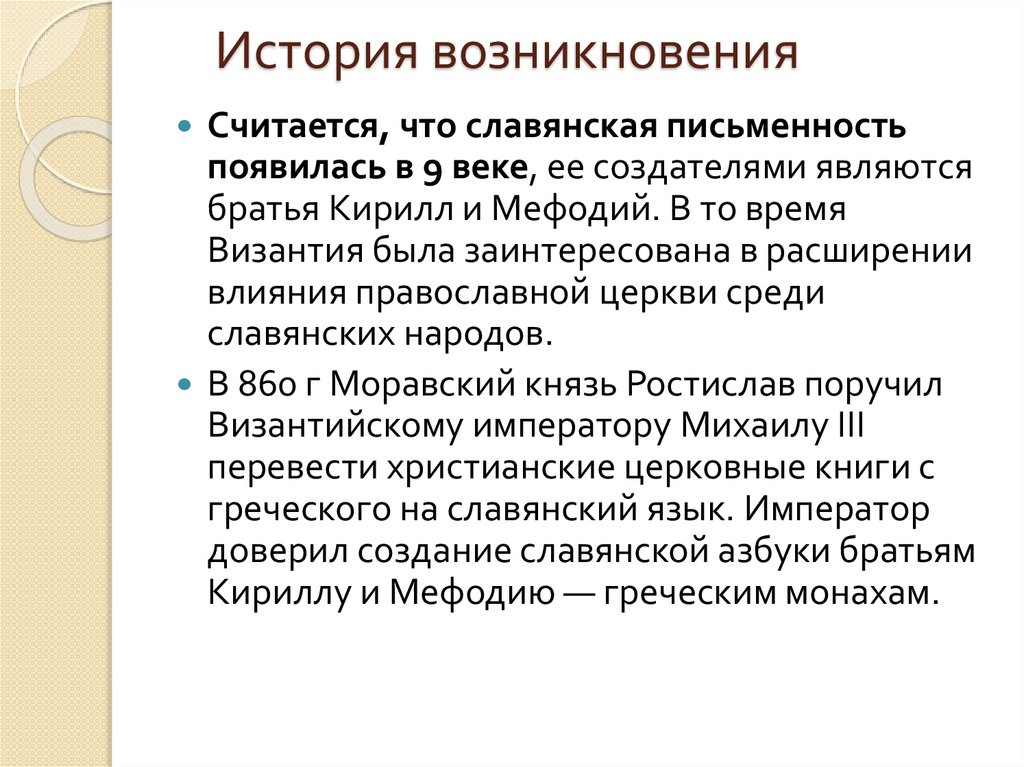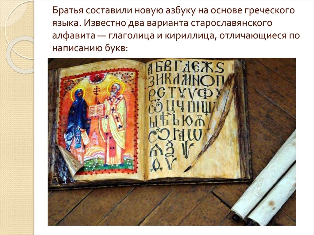 Братья составили новую азбуку на основе греческогоязыка. Известно два варианта старославянского