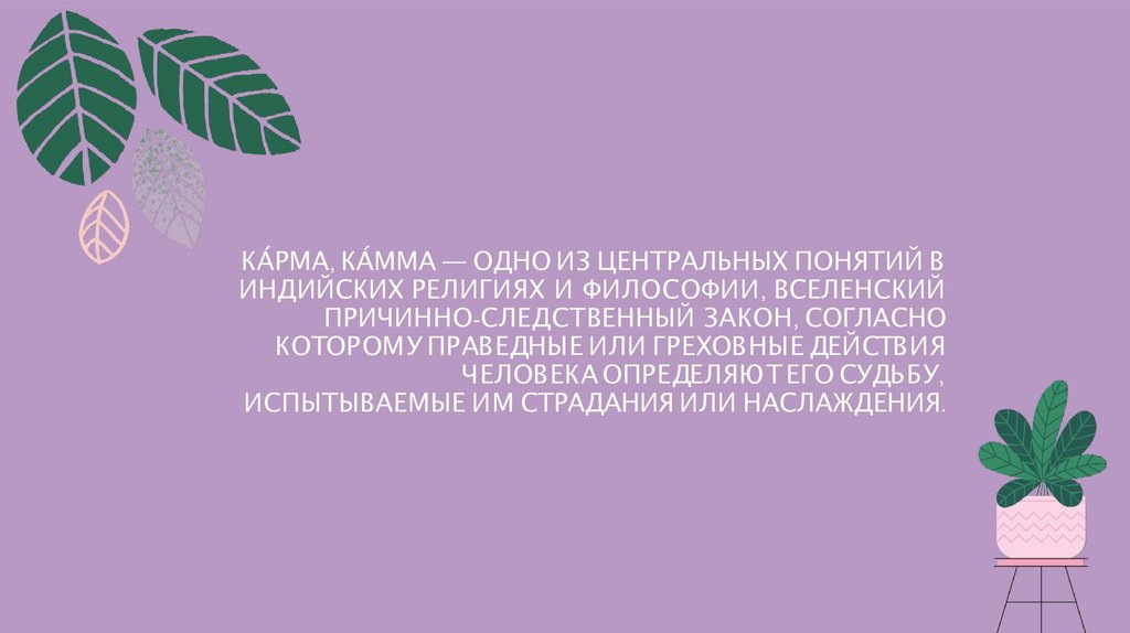 КА́РМА, КА́ММА — ОДНО ИЗ ЦЕНТРАЛЬНЫХ ПОНЯТИЙ ВИНДИЙСКИХ РЕЛИГИЯХ И ФИЛОСОФИИ , ВСЕЛЕНСКИЙ