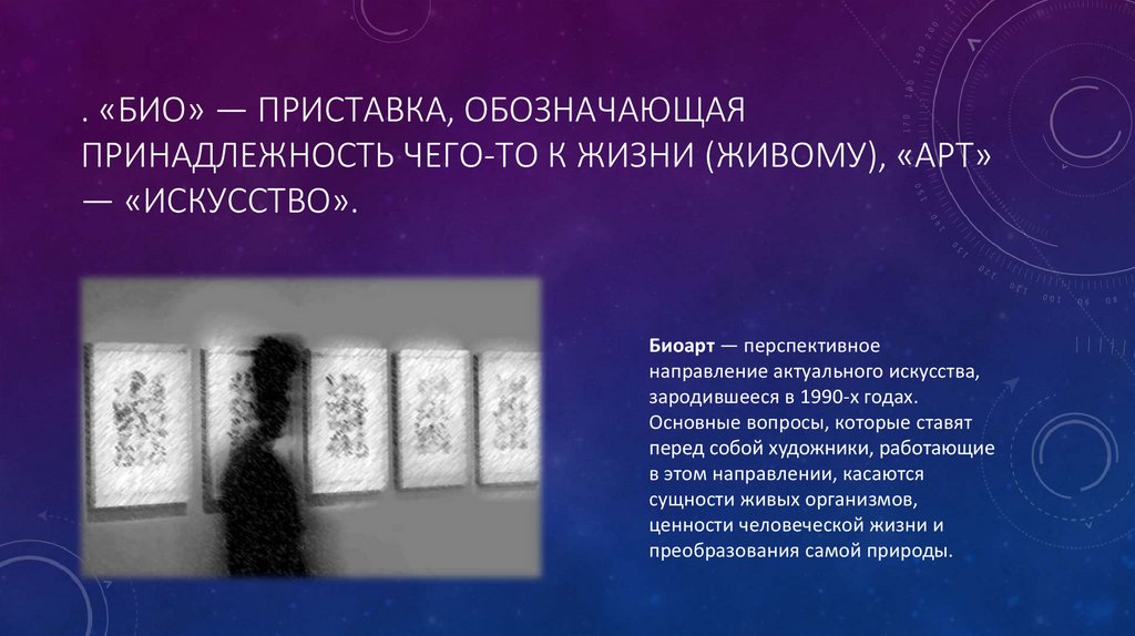 . «БИО» — ПРИСТАВКА, ОБОЗНАЧАЮЩАЯПРИНАДЛЕЖНОСТЬ ЧЕГО-ТО К ЖИЗНИ (ЖИВОМУ), «АРТ»