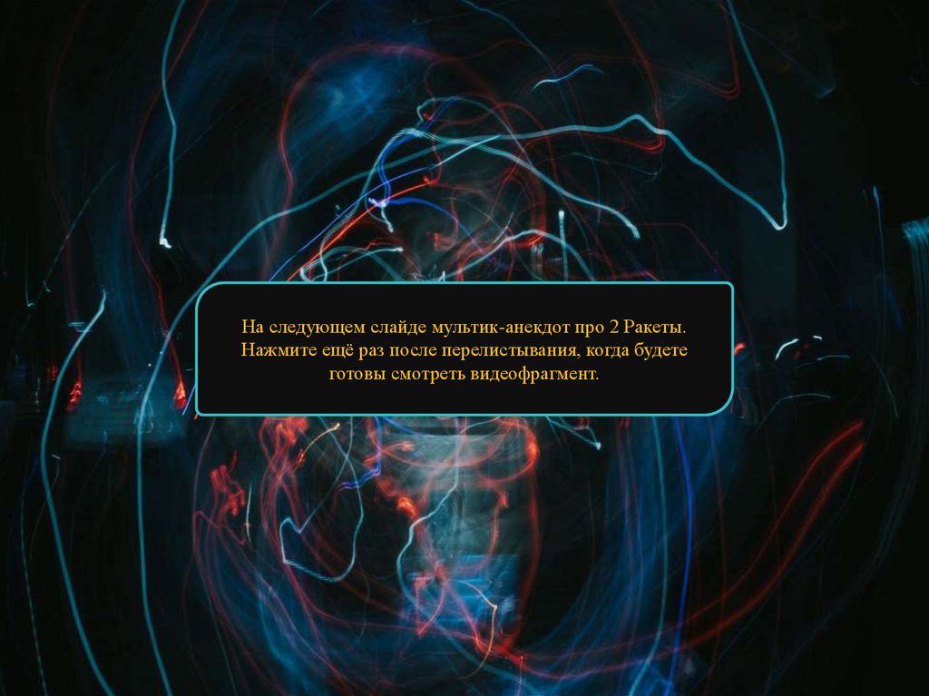 На следующем слайде мультик-анекдот про 2 Ракеты.Нажмите ещё раз после перелистывания, когда будете