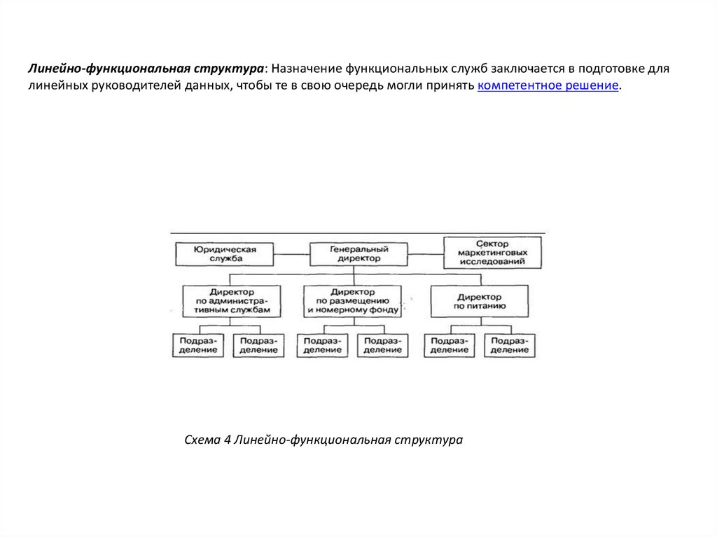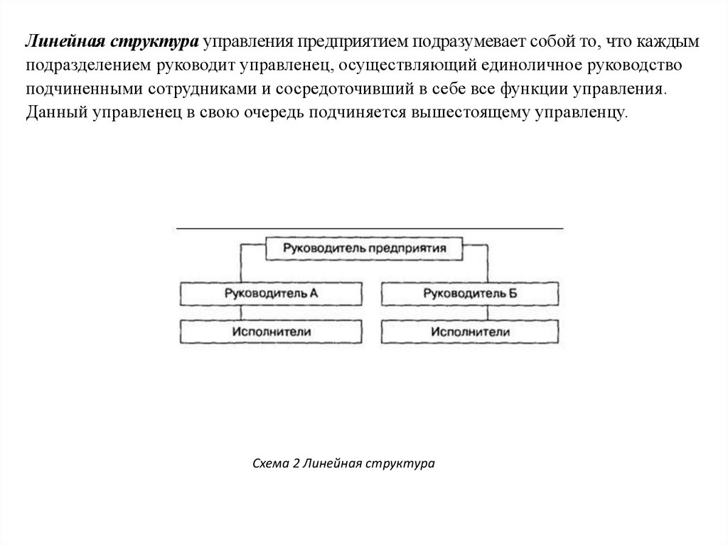 Линейная структура управления предприятием подразумевает собой то, что каждымподразделением руководит управленец, осуществляющий единоличное руководство