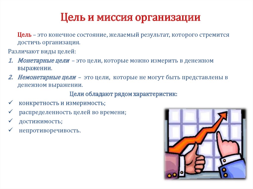 Цель и миссия организацииЦель – это конечное состояние, желаемый результат, которого стремится